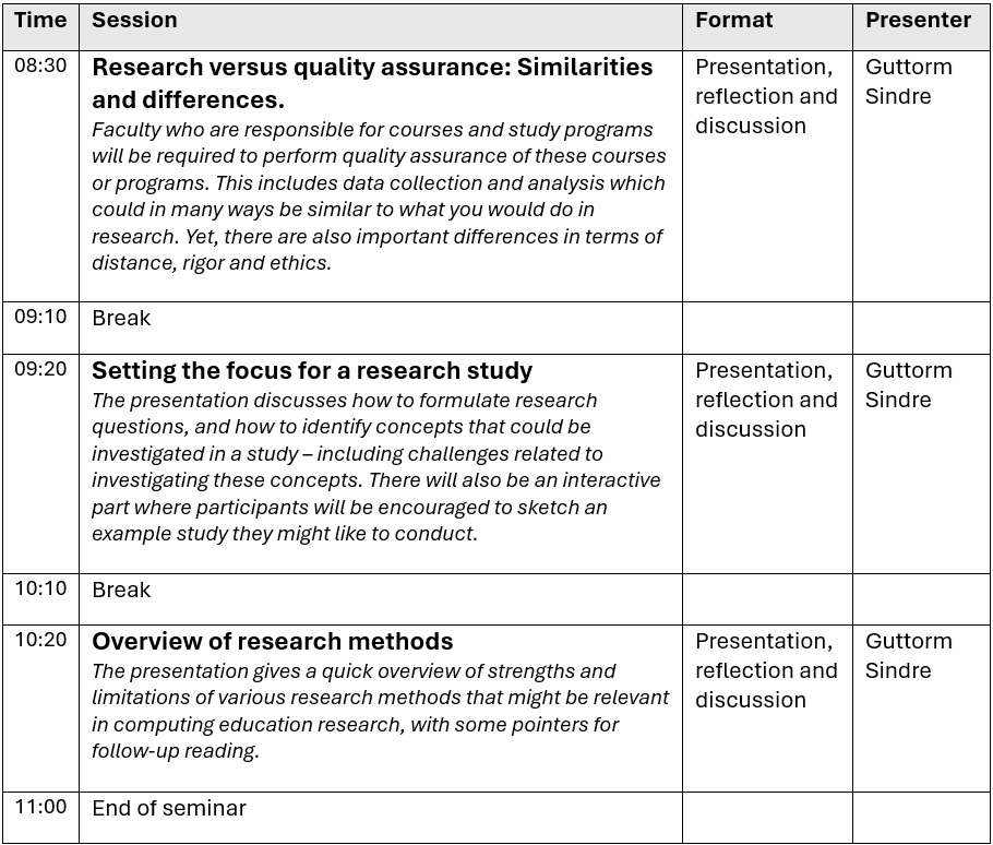 In this seminar we will look at research methods related to one’s own teaching / educational offerings. This research typically investigates factors affecting the students’ learning and satisfaction.