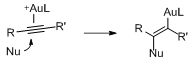 Gold catalysis has been neglected by organic chemists for a long time. However, homogenous gold catalysis of organic reactions has in recent few years become a rapidly expanding field. Gold complexes are less oxophilic than other common Lewis acids, but they are highly reactive as carbon Lewis acids (e.g. double and triple bonds). Gold catalysts can therefore react in a very selective way and give access to highly complex molecules. Gold complexes coordinate to C-C multiple bonds. Gold catalysts interact with the p-system and activates for nucleophilic attack, as shown below. In recent years homogeneous gold catalysis has emerged considerable attention for the activation and subsequent functionalization of alkynes: