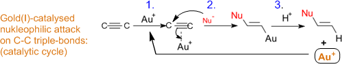 Typical reaction pathway for nucleophilic attack at alkynes by gold(I)-catalysed activation of triple bonds