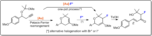 - A new gold(I)-catalysed regioselective transformation, based on a Petasis-Ferrier rearrangement / fluorination was developed to give3-fluoro-tetrahydropyran-4-one derivatives.