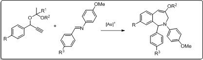 As part of our investigations on the chemistry and the potential of the highly reactive propargyl acetals, we studied the transformation of phenylpropargyl acetals and benzaldimine substrates in the presence of a gold(I) catalyst.