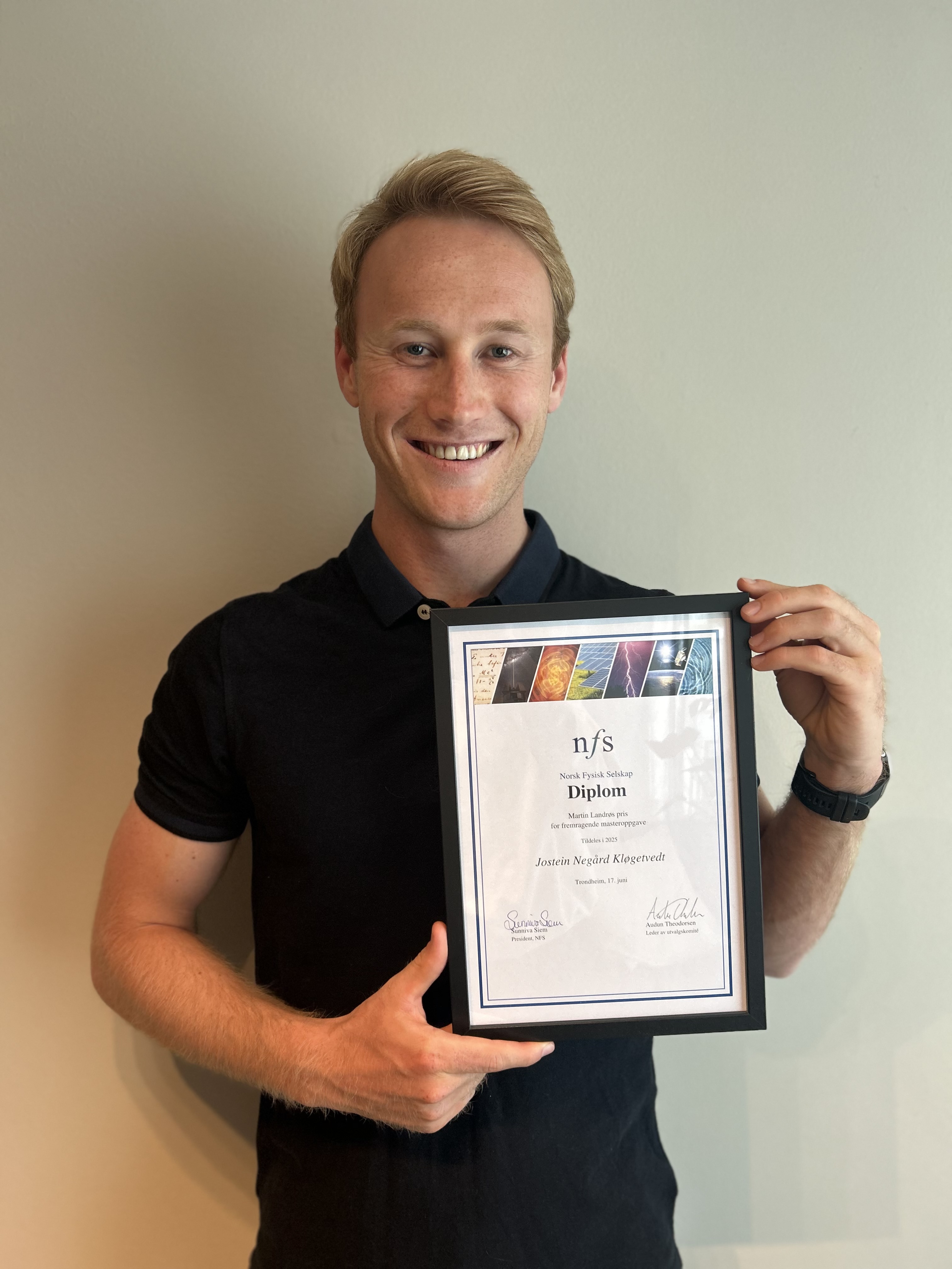 MSc graduate Jostein Negård Kløgetvedt received 2025 biannual Martin Landrø's award for an excellent master's thesis in physics from Norsk Fysisk Selskap. Jostein finished his master's thesis spring 2023 under the supervision of Research Professor Alireza Qaiumzadeh at QuSpin.