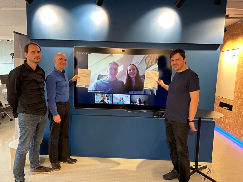 Each academic year the Visual Computing Laboratory here at NTNU offers the Visual Computing Schlumberger Prize of 25 000 NOK to the best performing student(s) within the three Visual Computing courses. The aim of this prize is to stimulate students to follow this important area of computing and this year's joint winners were Armin Bodingbauer and Stella Lukasser. The award was virtually handed over to them in the AI lab on Friday September 15th, by Frank Lindseth, Theoharis Theoharis and Gabriel Kiss (pictured). Representatives from SLB were also present online to celebrate the two students.