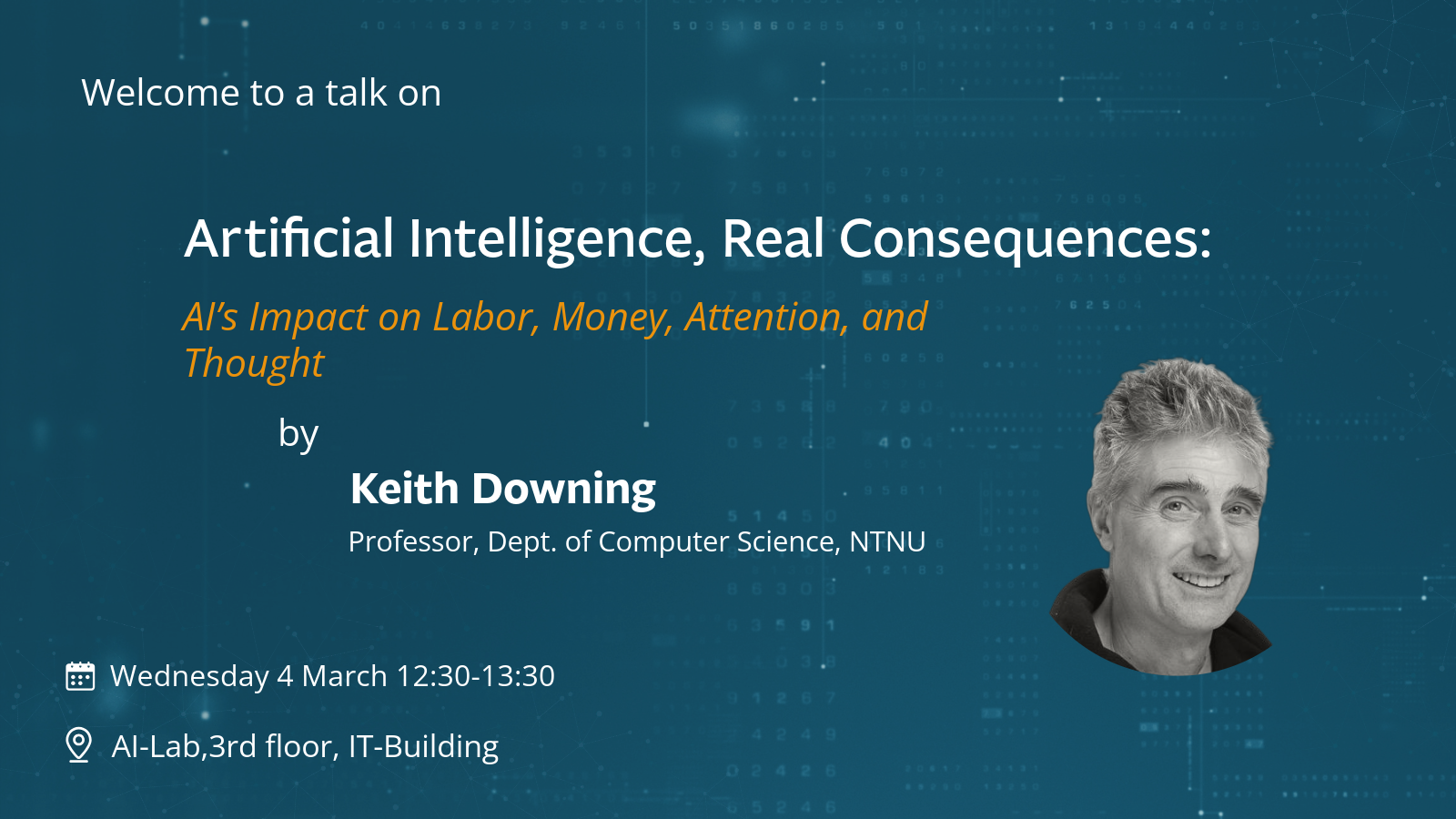 Listen to the seminar by Professor Keith Downing: "Artificial intelligence, real consequences". This talk examines the histories of four areas (work, finance, attention and human cognition) and discuss the role that AI has played in them so far and could possibly play in the future.