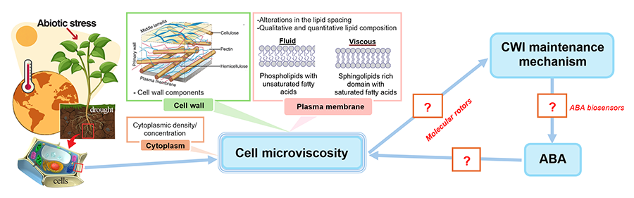 A major factor contributing to the current acute food insecurity is extreme weather events. Recent severe heatwaves and prolonged drought reduced crop yields by up to 45%, which put us on the brink of a hunger crisis on a catastrophic level1,2. Therefore, developing new strategies to enhance crop resilience against environmental stress is extremely important. The plant cell wall is of key interest here due to its role as the first line of defense against biotic and abiotic stress3. Unfortunately, manipulating cell wall structure and metabolism to produce an improved version of crops remains very challenging4-5. Any impairment in cell wall functionality seems to be detected by the cell wall integrity (CWI) maintenance mechanism, which monitors the functional integrity of cell walls by utilizing receptor-like kinases and ion channels in the plasma membrane to detect cell wall damage and initiate wall remodeling6-7. One of the cellular properties involved in these responses is microviscosity, which influences the diffusion rates of all molecules and affects important biological processes8.