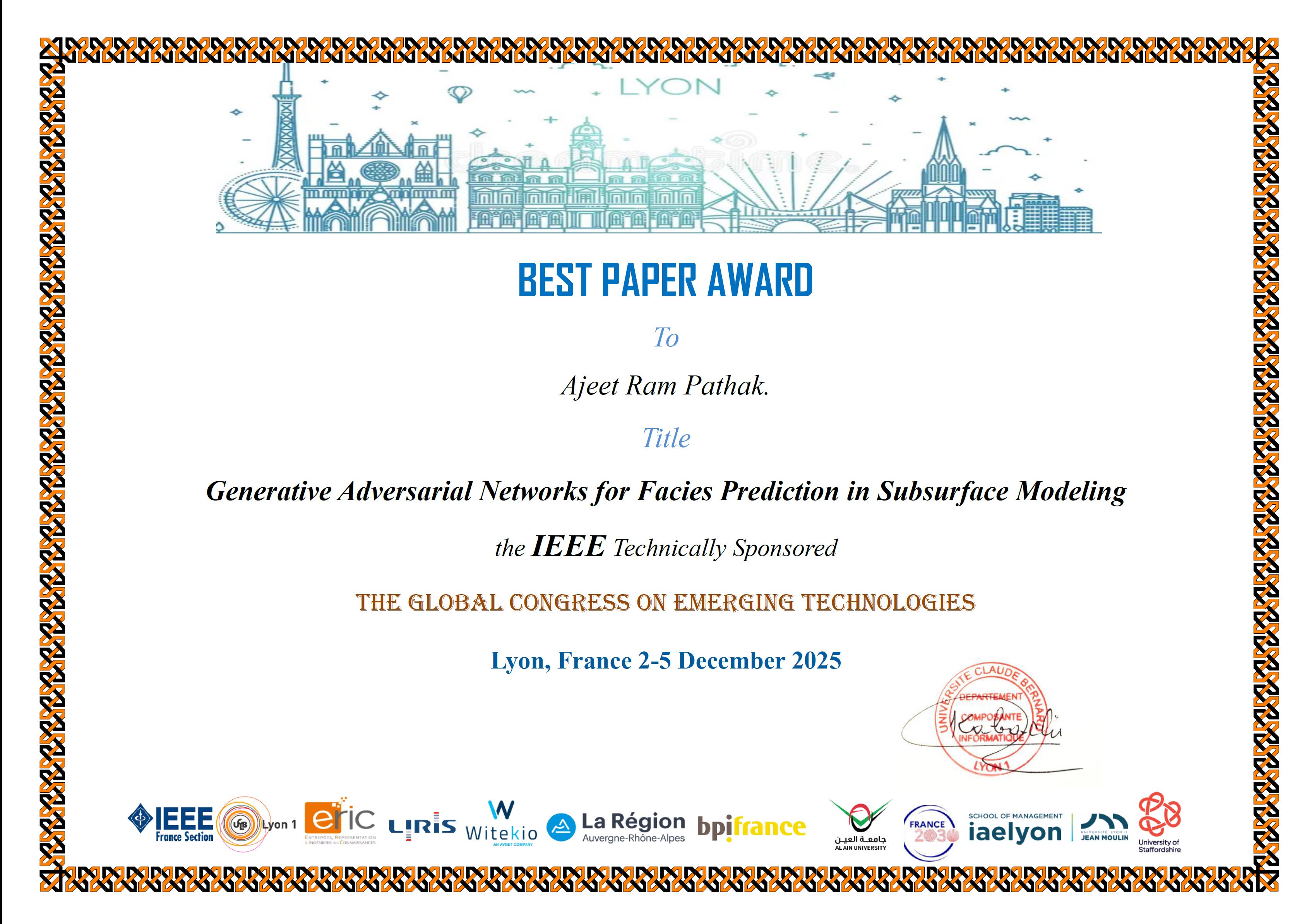 We are happy to congratulate CGF postdoc Ajeet Ram Pathak on receiving a Best Paper Award at the IEEE Global Congress on Emerging Technologies (GCET 2025) in Lyon in December. The paper, “Generative Adversarial Networks for Facies Prediction in Subsurface Modeling,” was selected as one of only two Best Paper recipients during the conference, which had participants from more than 50 countries.