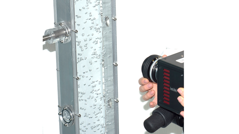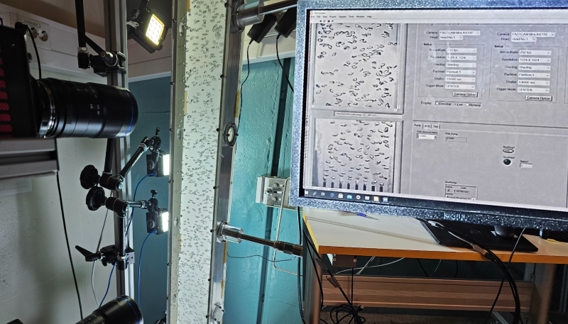 Experimental setup for a bubble column where the dynamics of rising multiple bubbles in complex liquids are recorded using high-speed cameras and analyzed with image processing algorithms.