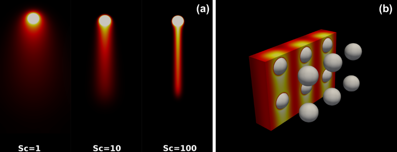 Mass transfer simulation: Species distribution in a quiescent liquid from (a) a single rising bubble and (b) multiple rising bubbles, simulated using sharp and diffuse interface solvers, respectively.