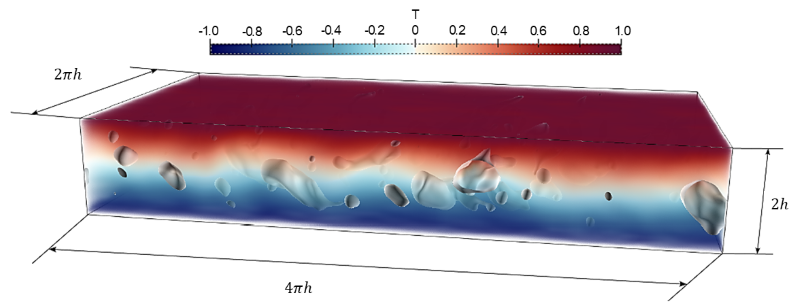 Heat transfer simulation setup: Sketch of the computational domain where the flow moves from left to right. Two immiscible phases (carrier and dispersed) are enclosed between two differentially heated walls. In this simulation, the temperature is treated as a passive scalar.