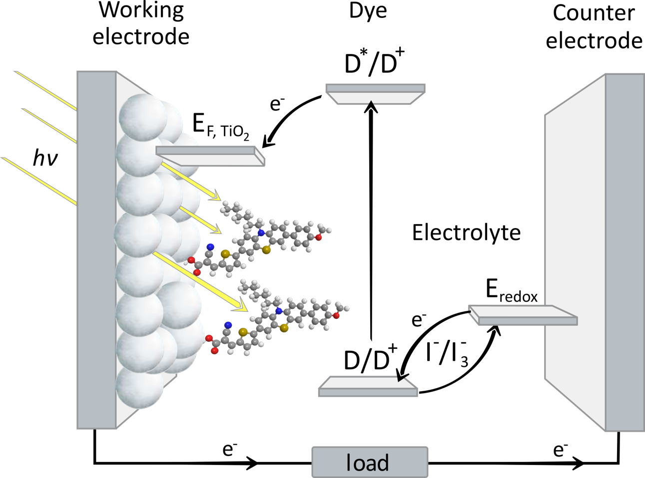 Solar cells are fabricated through screen printing or doctorblading titanium dioxide paste on fluorine-doped tin oxide coated glass. It is fired in a programmable furnace. Counter electrodes can be manufactured by dropcasting a thin layer of platinic acid, or by electrodeposition-polymerization of PEDOT. Solar cell devices are assembled and sealed in a drybox under controlled heating and electrolyte is filled by vacuum backfilling.