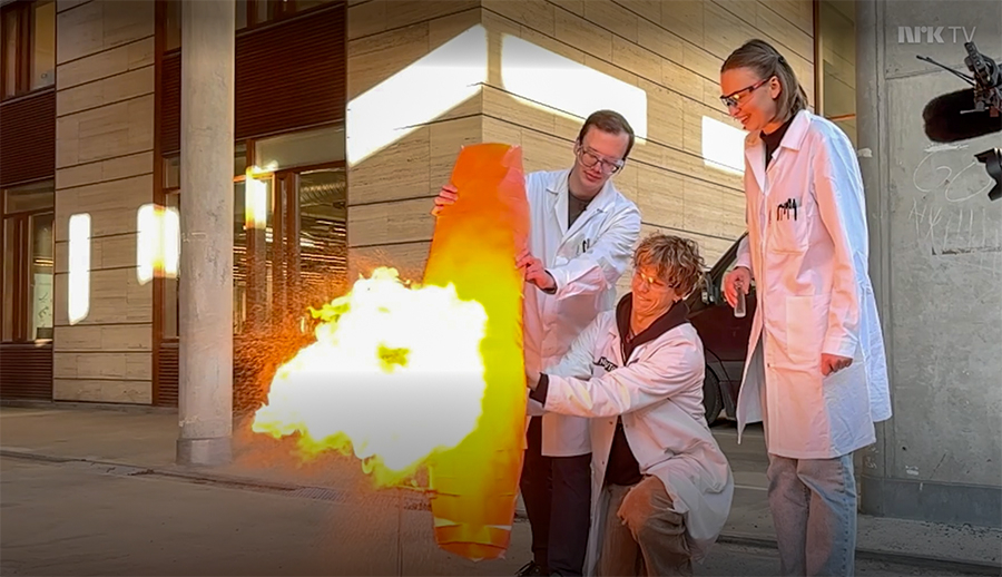 Erling and Cathrine filmed an episode of Newton that aired on NRK during Easter. They distilled an oil from orange peel and made a flamethrower. See the episode in NRK TV!