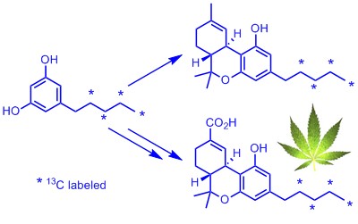 - M. Karlsen, H.L. Liu, J.E. Johansen, B.H. Hoff, Synthesis of [13C4]-labeled D9-tetrahydrocannabinol and 11-nor-9-carboxy- D9-tetrahydrocannabinol as internal standards for reducing ion supressing/alteration effects in LC/MS-MS quantification, Molecules 19 (2014) 13526-13540.