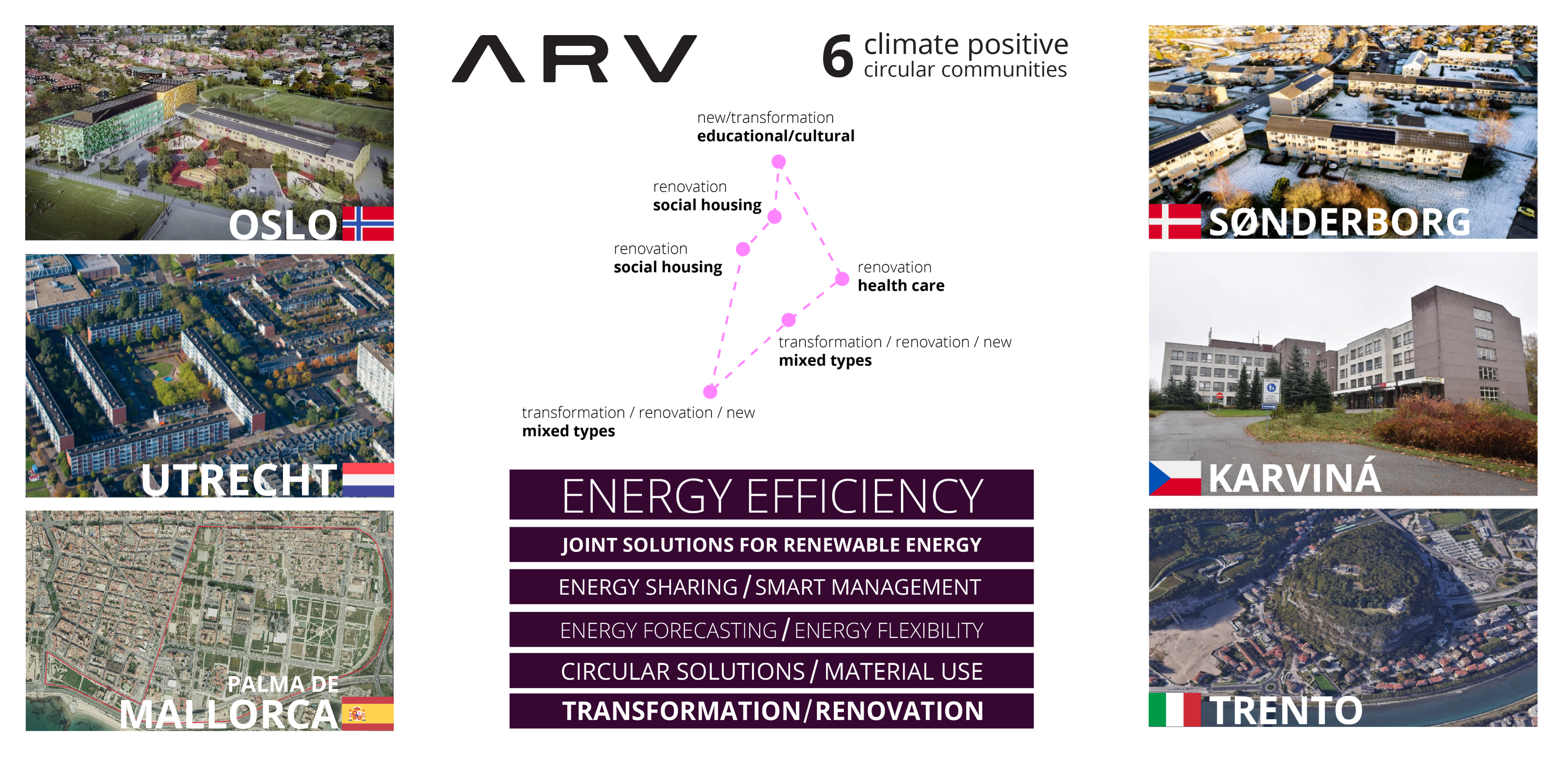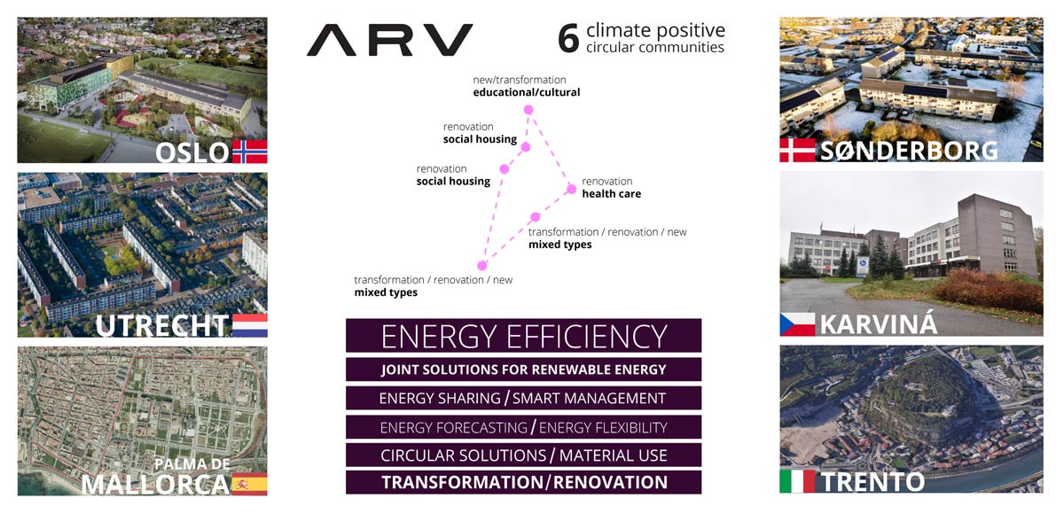 The vision of the ARV project is to contribute to speedy wide scale implementation of Climate Positive Circular Communities (CPCC) where people can thrive and prosper for generations to come. The overall aim of the ARV project is to boost the building renovation rate and to enable rapid and wide-scale deployment of CPCCs around Europe.