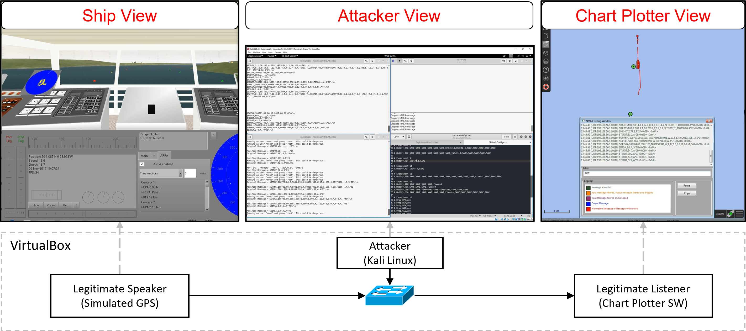 The testing environment can be used to realize different attacks. The ship view is produced using the bridge command simulator, which is utilized as the NMEA sender. The simulator includes a simulated GPS device sending NMEA messages over UDP to the listener. On the other hand, the chart plotter view is produced by the OpenCPN chart plotter software, which is utilized as the NMEA listener. Moreover, 𝑊𝑖𝑟𝑒𝑠ℎ𝑎𝑟𝑘 is utilized for capturing the network traffic at the receiving node. The attacker node operates the Kali Linux operating system with the NMEA-Manipulator system.