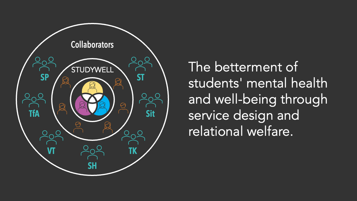 Service design provides the framework for proposing strategic interventions. Through this framework, the StudyWell project is able to prioritize four strategic areas: the individual, the community, the systems and the future. Relational welfare provides the theories and perspectives for addressing chronic problems such as mental health from a societal perspective.