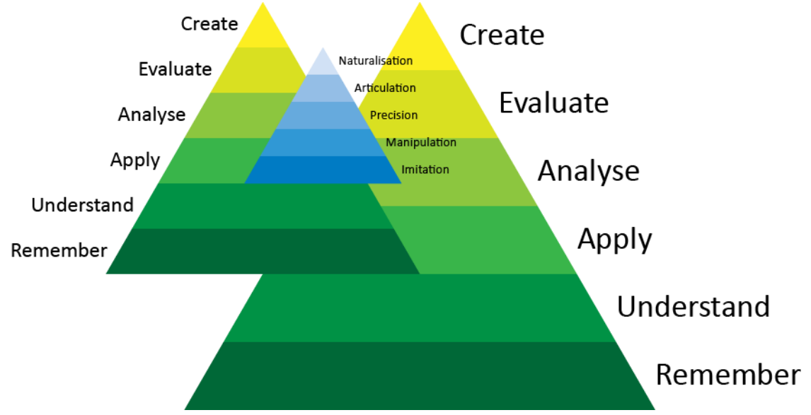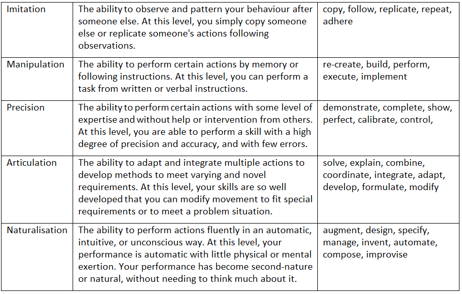 Psychomotor: There are three commonly referenced taxonomies within the psychomotor domain:Dave (1970), Harrow (1972) and Simpson (1972). These are also recognised in Krathwohl’s overview of the 2001 revision of Bloom’s taxonomy. The Simpson and Harrow psychomotor taxonomies are especially useful for describing the development of the relationship between cognition and physical movement from birth through to adulthood, or for developing skills within the performing arts and sports. The psychomotor taxonomy by Dave is perhaps more transferable across disciplines as there is less emphasis on movement, and rather describes progressive degrees of competence in performative actions.
