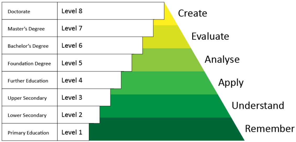 Using the European Qualifications Framework for reference, and with the cognitive domain taxonomy as an example, we can map the whole educational system to the hierarchy of educational objectives. Using this as a tool is a useful way to think about graduate level learning outcomes at an institutional or study programme level. We get an idea of how far along the educational system the student is, what level of knowledge we can expect them to have on entry and what level we should be aiming towards. However, this is only useful if the subject matter is covered at all previous levels of education.