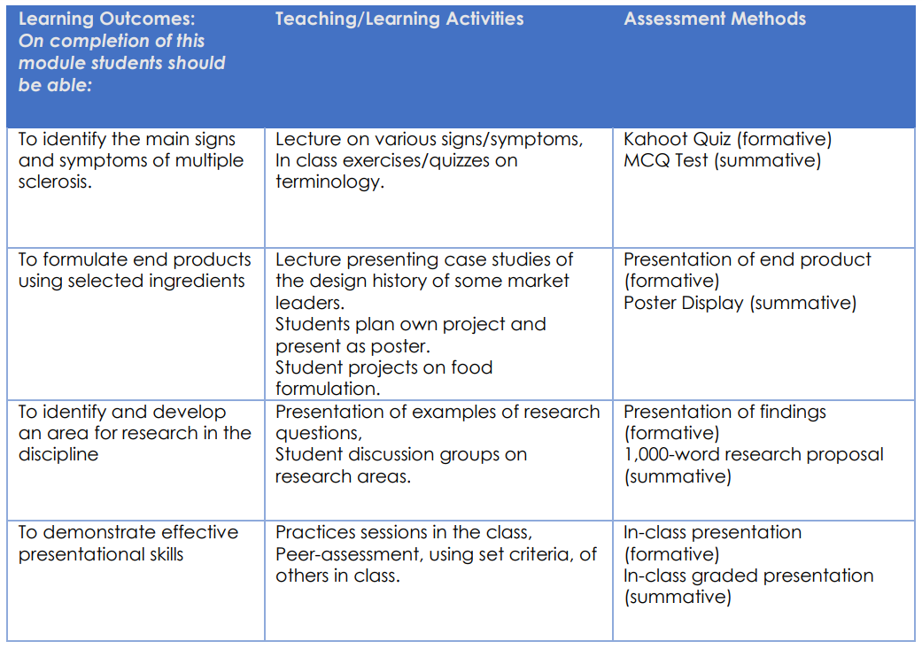 Using a constructive alignment matrix can help to map the intended learning outcomes with the assessment and teaching methods:
