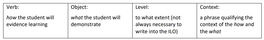 It is important that outcomes are stated in the future tense, in terms of what students should be able to do as a result of learning. ILOs should also include performative actions that are observable or measurable. For example, ILOs such as “Students will develop their understanding of…” describes the process rather than the outcome, and is a latent term that would be difficult to quantify.