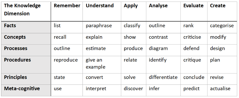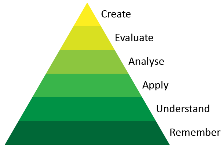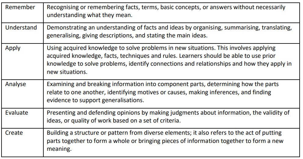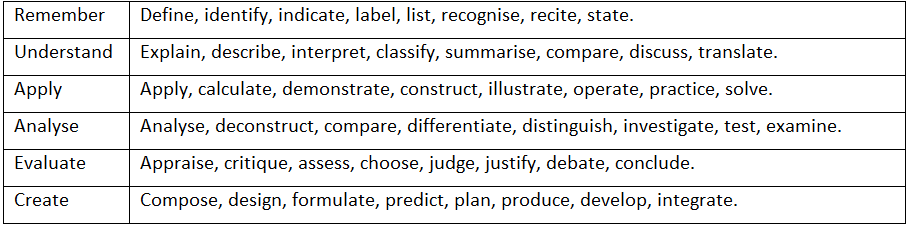 Using the revised (2001) version of the cognitive domain, the following table describes the levels of learning in ascending order of Remember, Understand, Apply, Analyse, Evaluate and Create: