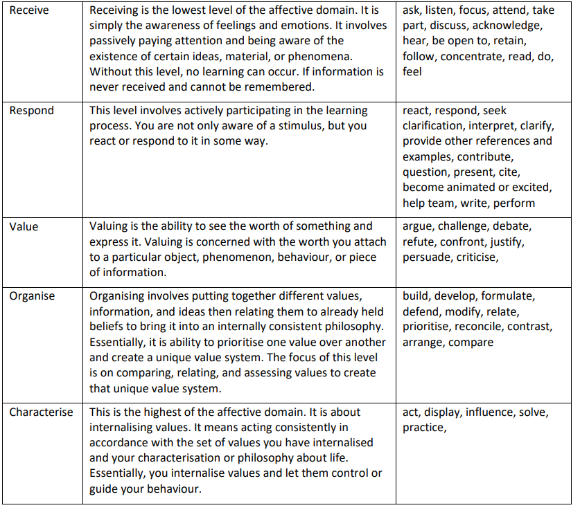 Affective: The Affective Domain was classified and described by Krathwohl, Bloom and Masia (1964)in Handbook II of the Taxonomy of Educational Objectives and presents a taxonomy for developing attitudes, character and conscience – also expressed in various literature as interests, appreciations,values or emotional sets. Central to the affective domain is the concept of internalisation: whereby interacting with external stimuli progressively shapes the individual’s perspective of the world.Example quality assessment
