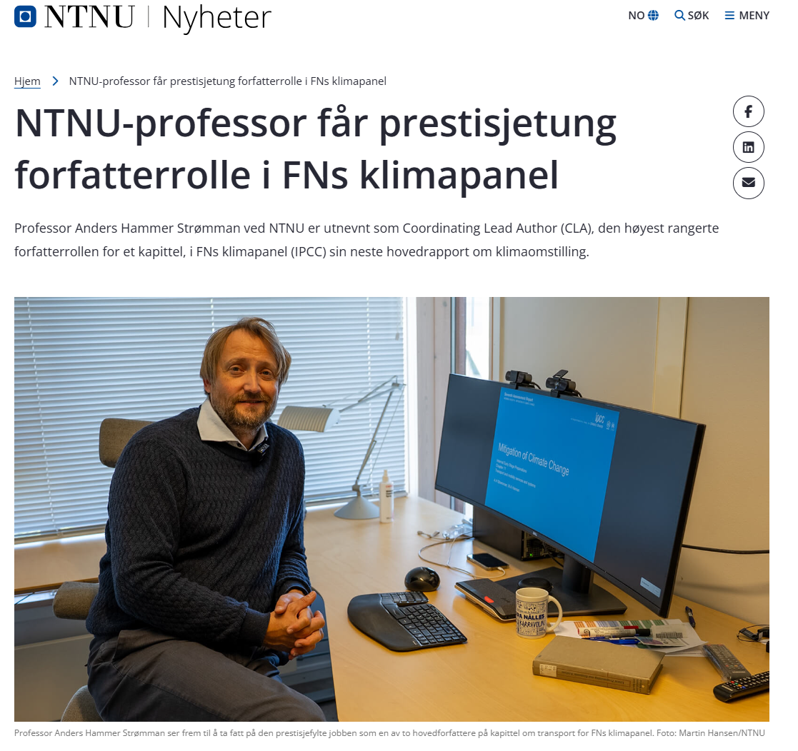 News - Prof. Strømman Appointed Lead Author in Upcoming IPCC Climate Report