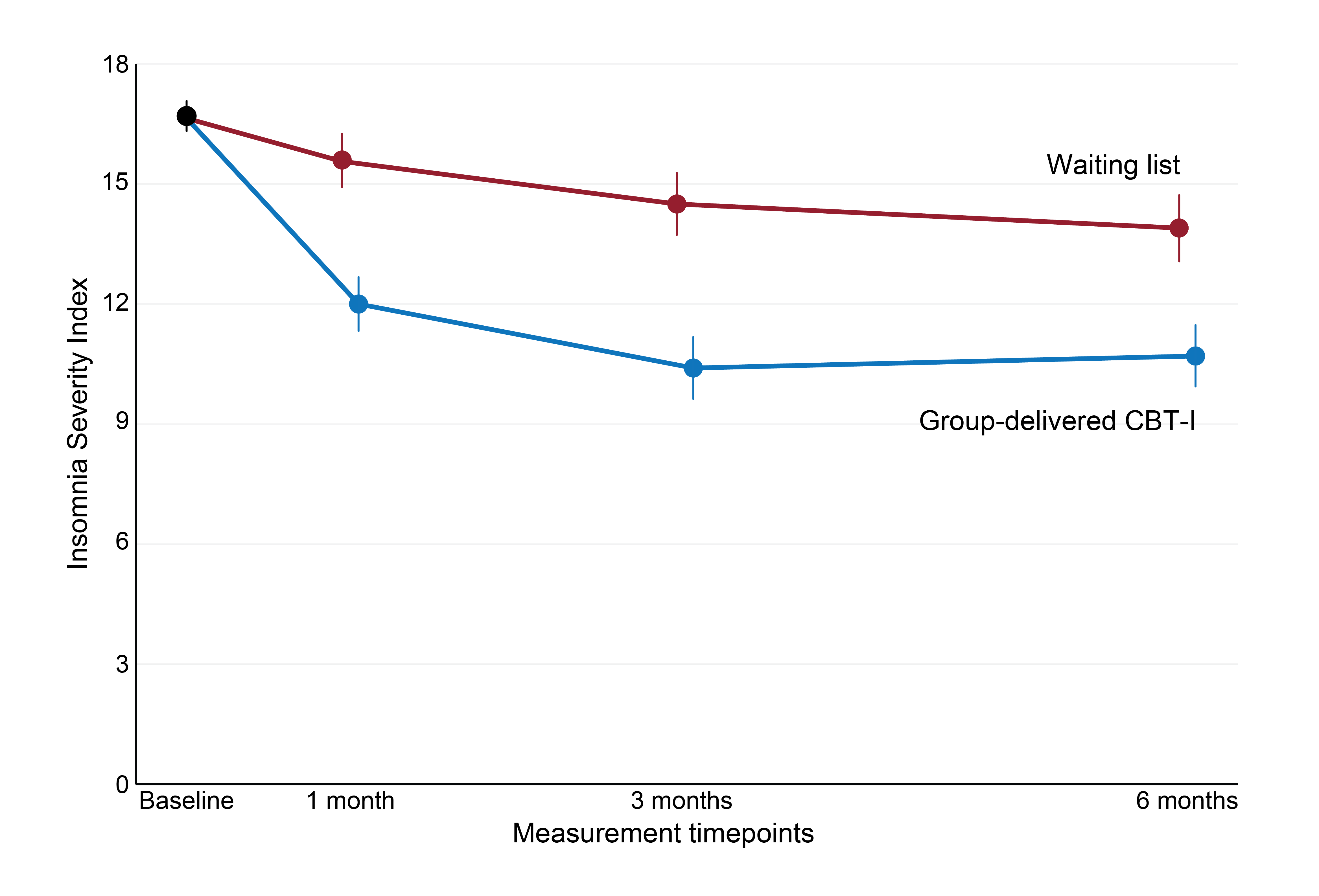 The main outcome of the study was the difference between group-delivered CBT-I and waiting list in the severity of insomnia, measured with the ISI. At 3 months post-intervention, the estimated average difference in the degree of insomnia between the groups was 3.4 ISI points – group-delivered CBT-I participants had a score of 10.7 points, while the ISI score for the waiting list was 14.1 points. This shows that participants who received group-delivered CBT-I had less insomnia at 3 months post-intervention. The effect was maintained at 6 months post-intervention, indicating a good long-term effect of the course (see Figure 2). Based on these results, we can conclude that participation in group-delivered CBT-I leads to less insomnia.