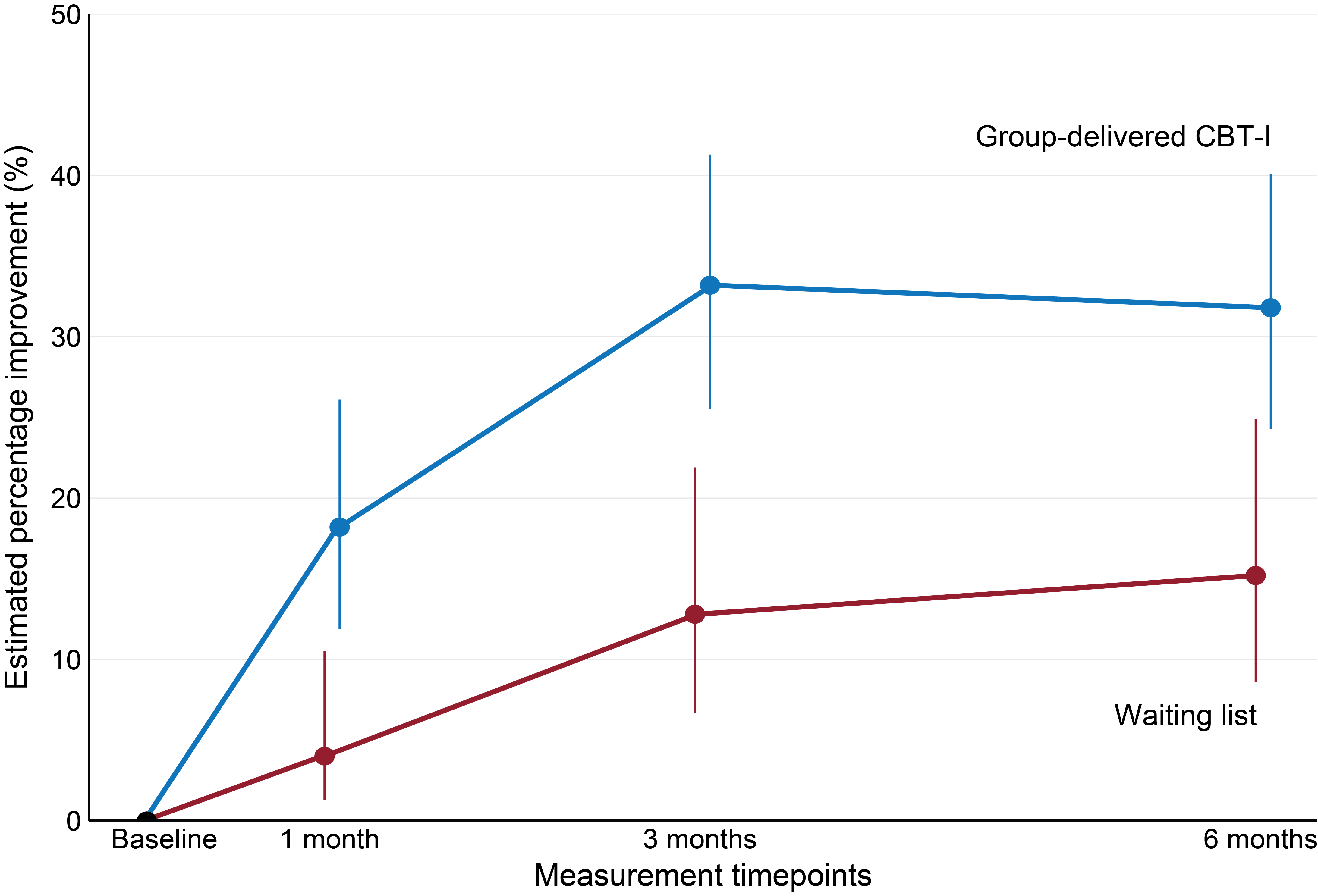 Another important measure in the study was clinically relevant improvement in insomnia, which provides a concrete assessment of the practical effect of group-delivered CBT-I. Clinically relevant improvement in insomnia was defined as a difference of at least 8 points on the ISI scale from baseline to 3 months post-intervention. At 3 months post-intervention, 34% of the group-delivered CBT-I participants had achieved clinically relevant improvement in insomnia, while only 13% of the participants on the waiting list had achieved a similar improvement. This difference was maintained at 6 months post-intervention, indicating a good long-term effect of the course (see Figure 3). Thus, more participants who received group-delivered CBT-I had achieved a clinically relevant improvement in insomnia than the waiting list participants.