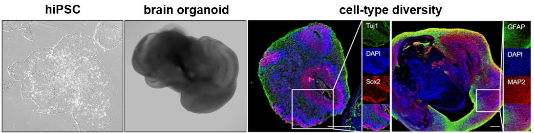 Brain organoids from participants of the Trønderbrain cohort generated through differentiation of human induced pluripotent stem cells (hiPSCs) show complex cytoarchitecture and great cell-type diversity.