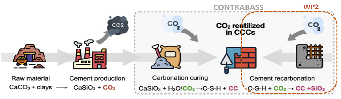In CONTRABASS, carbonation curing, cement recarbonation and calcium carbonate engineering are studied. Our project is part of WP2 on cement recarbonation, so studying the reabsorption of CO2 by cement. Figure 1 shows an illustration of the CCU through carbonation curing and cement recarbonation, highlighting the overall focus of the CONTRABASS project and the focus of this PhD project.