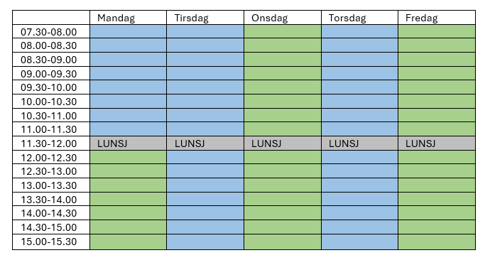 Booking hours between 08:00-15:15 not booked within 09:00 one day in advance can be booked by St. Olavs Hospital for patient examinations.