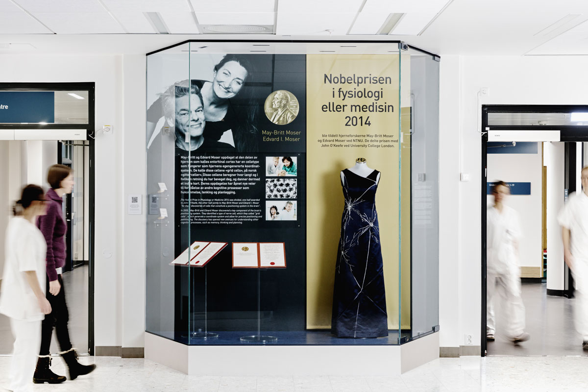 Neuroscientists May-Britt Moser and Edvard Moser from NTNU received the Nobel Prize in Physiology or Medicine in 2014, along with John O'Keefe from the University College London. The Nobel medals and the gala dress that was specially designed for May-Britt Moser for the Nobel award ceremony in Stockholm, are exhibited in Trondheim University Hospital.