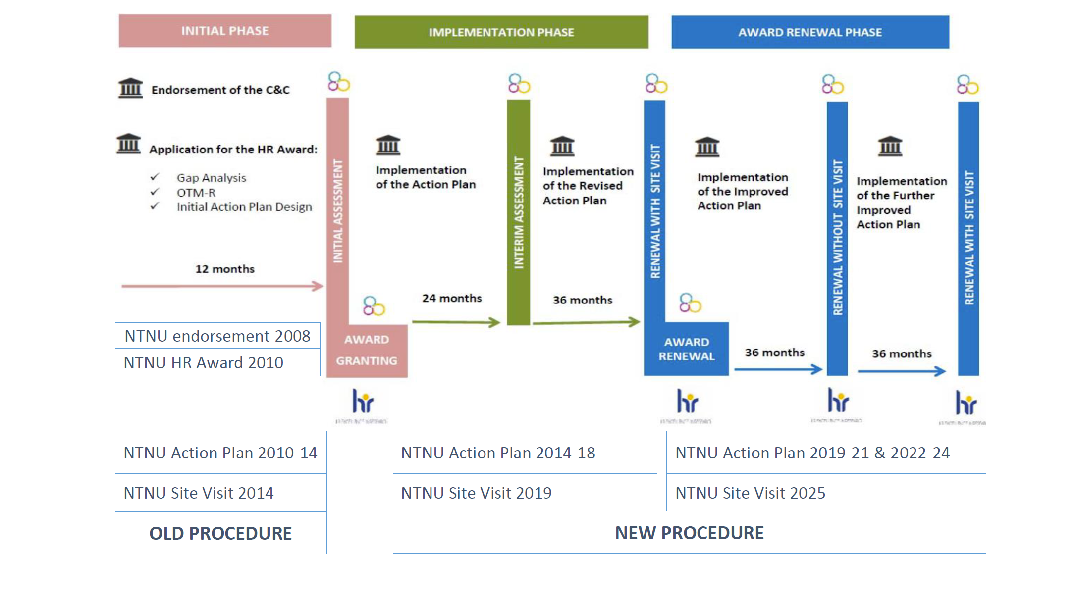 NTNU obtained the HR Excellence in Research Award in 2010, and maintained the acknowledgement by the European Commission after the external evaluation in 2014. NTNU continued the work during the "interim phase" while awaiting the "strenghtened" HRS4R to come in place.