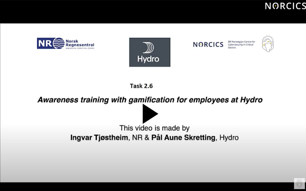 Ingvar Tjøstheim from the Norwegian Computer Center (NR), and Pål Skretting from Hydro provide an overview of their collaboration in Task 2.6 " Awareness training with gamification for employees at Hydro".