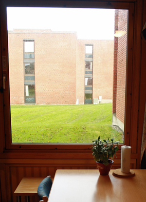 Hybelen ligger ved siden av kjøkkenet. Den er ikke stor. Den har ei brun seng, et brunt bord og et skap. Ei høy bokhylle står ved siden av døra. Under vinduet står et skrivebord. Det er stort. Gardinene er fæle. Her skal hun bo i ett år.