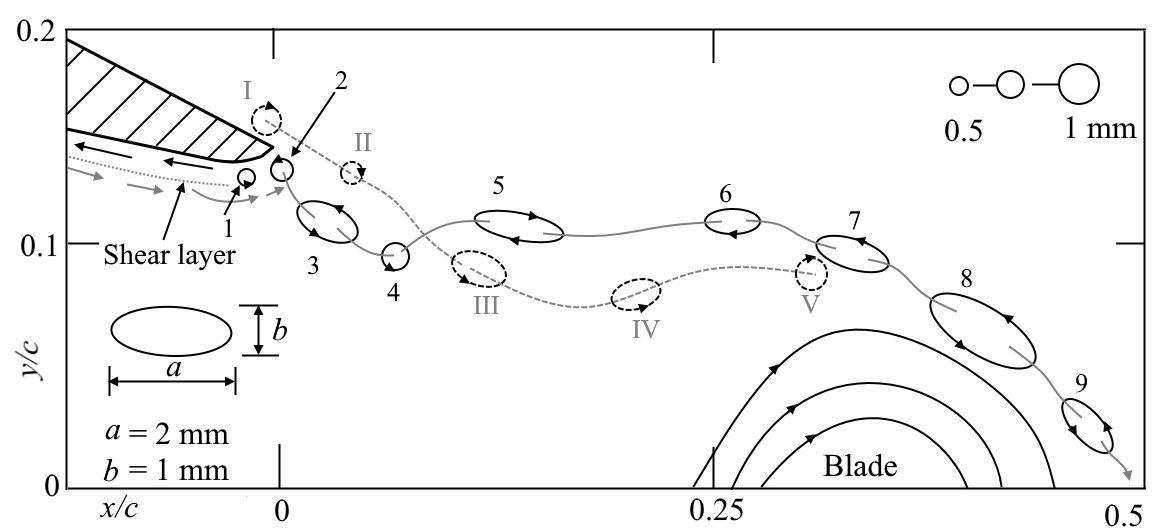 FIGURE 1. Trajectory of the wake, vortex inception, and propagation behind a guide vane. The continuous and dashed lines show the vortex inception from suction- and pressure-sides, respectively.