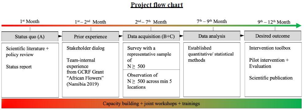 In the proposed study, we will focus on plastic bag consumption due to its relevance and popularity in the South African context. We will assess the psychological and situational drivers and barriers that determine the acquisition of plastic bags in the supermarket, their usage and different options of disposal. An interdisciplinary team from South Africa (environmental sciences and geography) and Norway (social and environmental psychology) is coming together with the relevant expertise regarding local circumstances, waste management systems, data collection, methodologies and human behaviour. In specific, we will look at 1) What are the behaviours leading to plastic bags being consumed in such a high rate and 2) What are the behaviours leading to plastic bags being spilled in the environment? We will apply a multi-methods approach consisting of A) a status review, B) a survey as well as C) observations (see project flow chart below), together feeding into the development of a pilot intervention. The status review will comprise key literature, policy reports and first-hand experiences from selected stakeholders in South Africa (e.g. waste management sector, retail, education, politics and tourism).