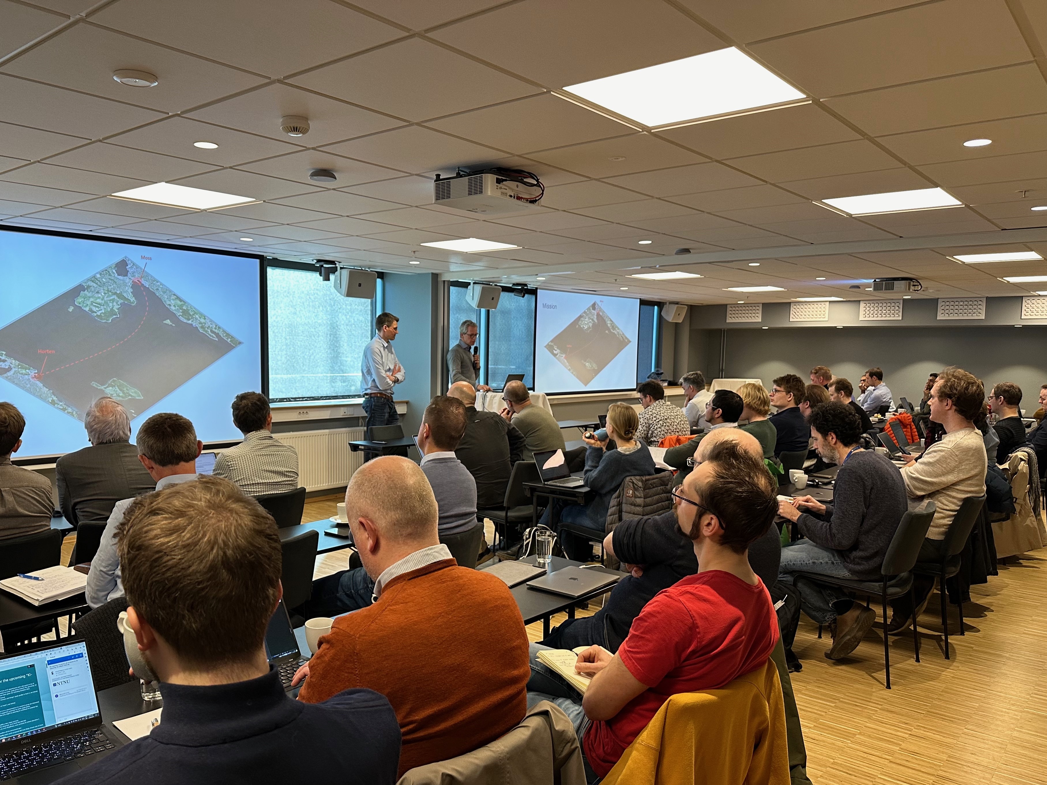 Presentations reflected the wide range of research and innovation activities of the Centre partners, including the Skipsrevyen-awarded "Ship of the Year 2024" Reach Remote 1 by Reach Subsea and Kongsberg Maritime; new DNV class notations for autonomous and remotely operated ships; an overview of the IMO's MASS code by NMA; presentations of results by 4 of our PhDs and PD graduates; the integration of autonomy in offshore operations by Fugro; our internal group on COLREGS; the student competition Njord Challenge; a demo of remote operation and auto-crossing of NTNU's autonomous vessels, milliAmpere 1 & 2; hardware and software on milliAmpere 1; autonomous ships and logistics performance by SINTEF Ocean; a periodically unmanned bridge presentation by IFE; and self-introductions by our 6 newly employed researchers.