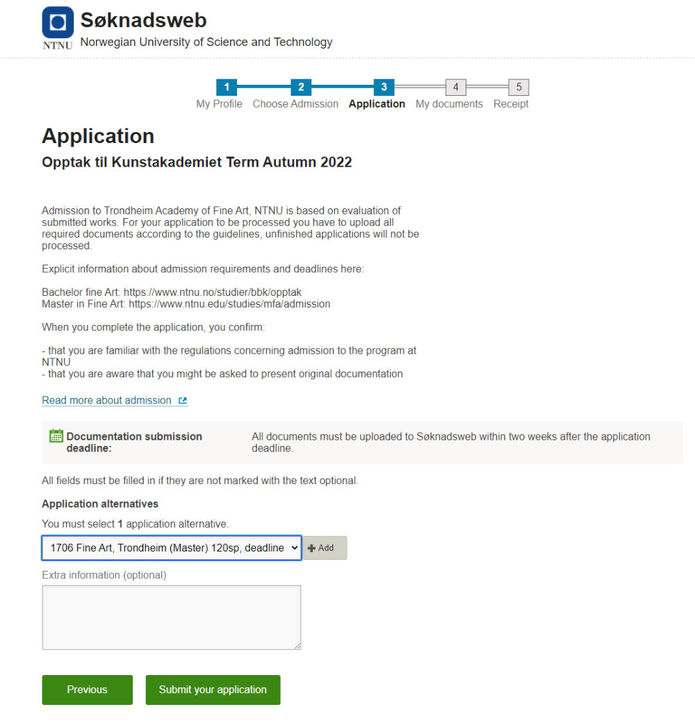 3. Select the correct Application alternatives: 1706 Fine Art, Tronsheim (Master) 120sp