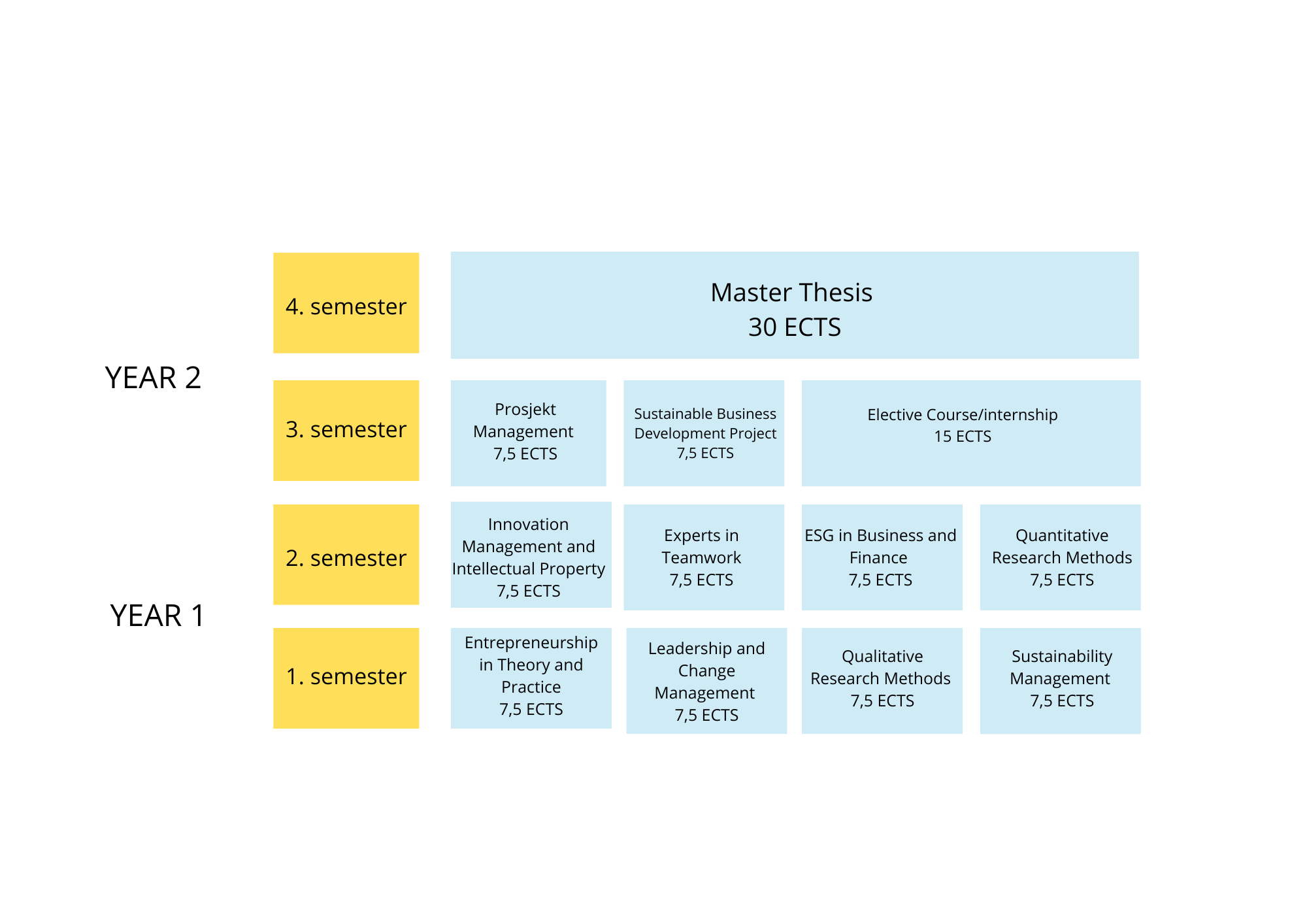 The Master of Science programme in Management of Innovation and Sustainable Business Development is a two year, full-time program, worth a total of 120 ECTS credits. Students will take 30 credits per semester.