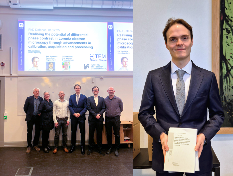 December 2025: Sivert Dagenborg had his PhD defense the 1st of December 2025. The title of his thesis was 'Realising the potential of differential phase contrast in Lorentz electron microscopy through advancements in calibration, acquisition and processing' with Assoc. Prof. Magnus Nord (NTNU) as supervisor and Prof. Antonius Theodorus Johannes van Helvoort (NTNU) as co-supervisor. His opponents were Prof. Anette Gunnæs from the University of Oslo and Prof. Trevor Almeida from the University of Glasgow, with administrator Prof. Ragnvald Mathiesen from the Department of Physics at NTNU. Congratulations to Sivert! Wishing you every success as you embark on the next chapter of your journey.